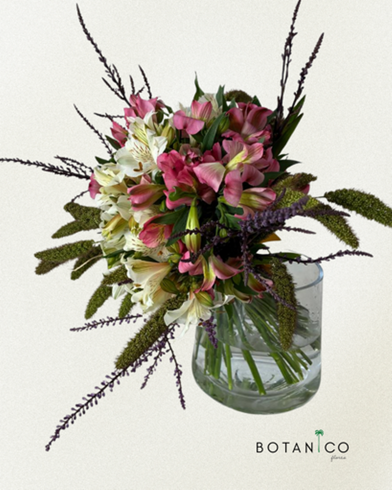 Inspirado na leveza das aquarelas, esse arranjo traz uma composição harmônica de flores em tons de rosa, branco e sementes lilás e verde. Montado diretamente no vaso, é perfeito para presentear com beleza e praticidade.