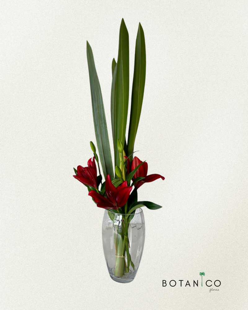 Inspirado em arte, esse arranjo traz uma composição harmônica de flores e folhas lineares. Montado diretamente nos vasos.